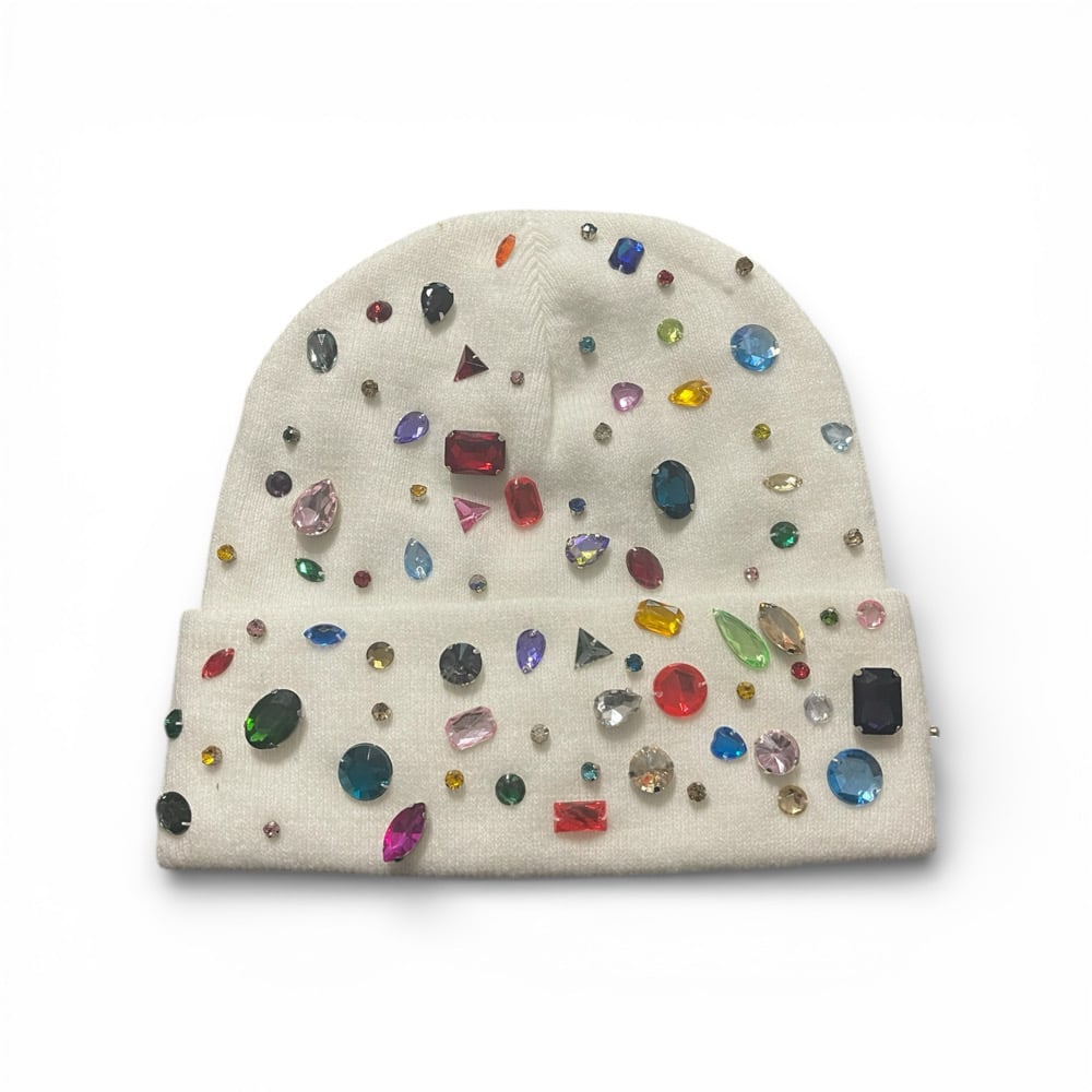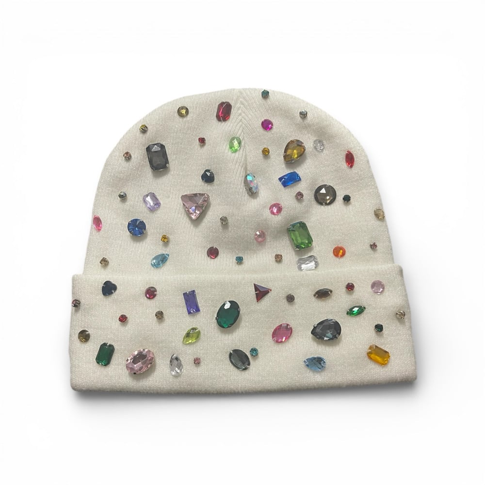 • Design: White knit beanie adorned with multicolor rhinestones and mixed-cut gems