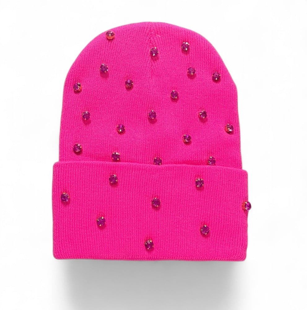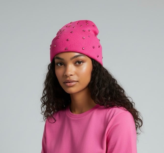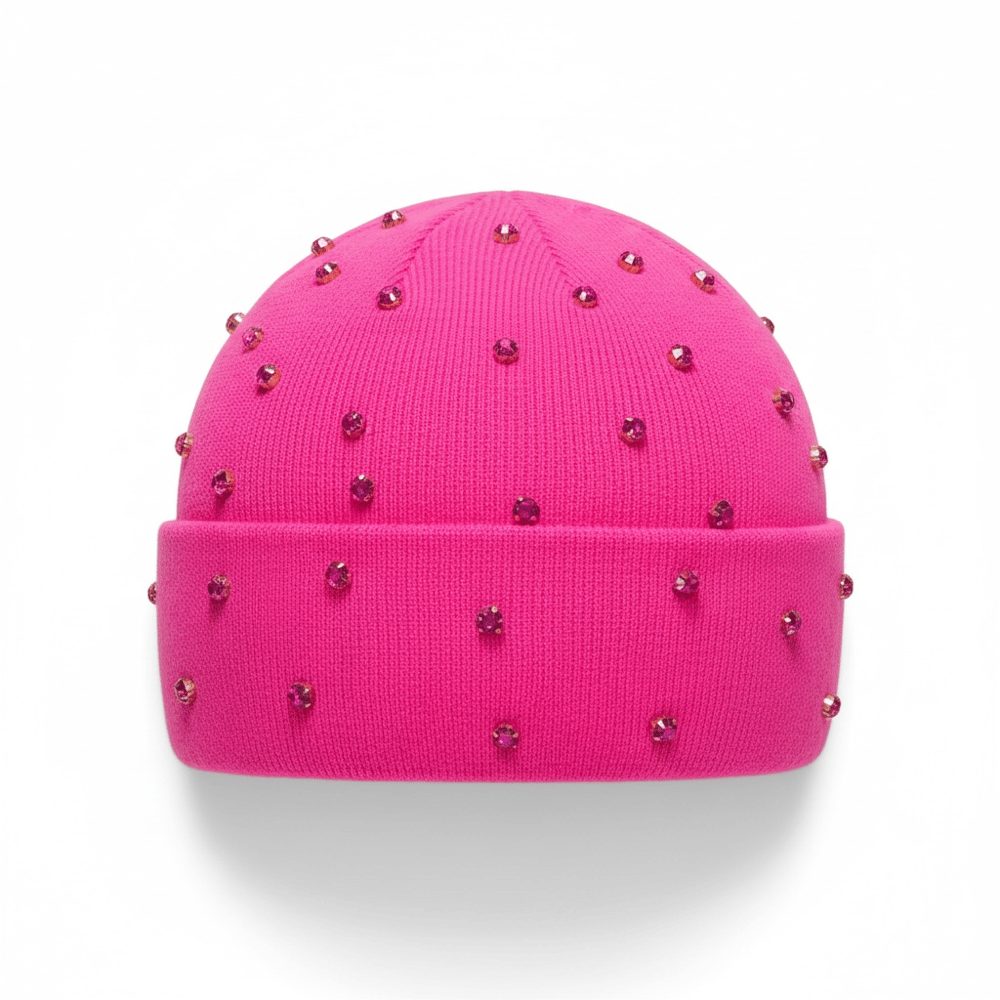 This custom pink-on-pink rhinestone beanie blends cozy comfort with high-glam sparkle. Crafted from a soft, stretchy knit, it’s fully embellished with tonal pink rhinestones that catch the light without overpowering the look. The folded cuff adds warmth and structure, making it as practical as it is statement-making.